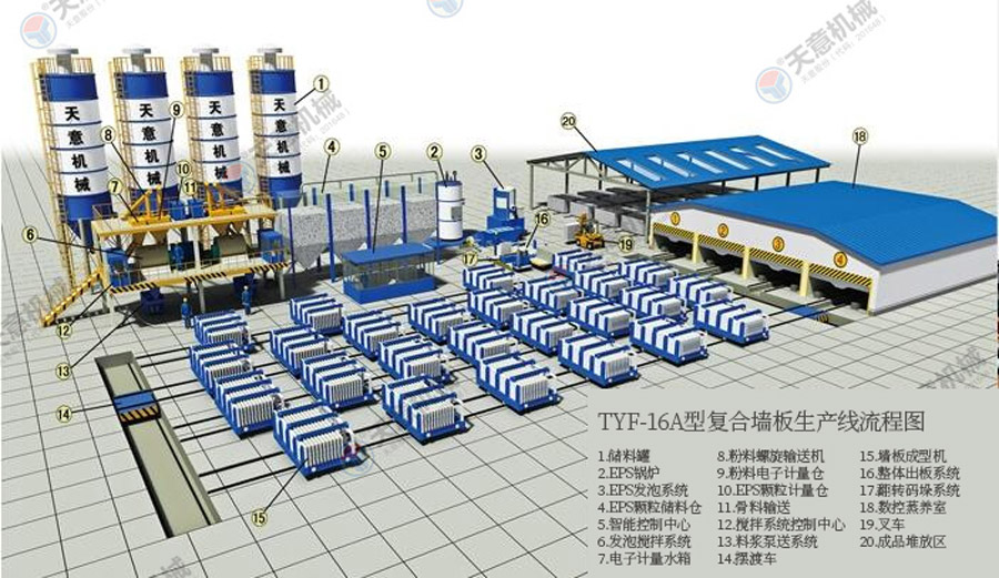TY12型墻板生產(chǎn)線包括:墻板成型機、整體穿抽管系統(tǒng)、發(fā)泡系統(tǒng)、水箱、電子計量儲料倉、螺旋上料輸送機、儲料罐、螺旋輸送機、EPS熟化料倉、硫化干燥床、EPS預發(fā)機、數(shù)控配電室、發(fā)泡攪拌機、整體出板系統(tǒng)、叉車、成品堆放區(qū)、擺渡車。