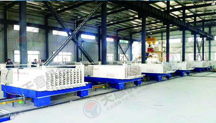 TY12型墻板生產(chǎn)線包括:墻板成型機(jī)、整體穿抽管系統(tǒng)、發(fā)泡系統(tǒng)、水箱、電子計(jì)量?jī)?chǔ)料倉(cāng)、螺旋上料輸送機(jī)、儲(chǔ)料罐、螺旋輸送機(jī)、EPS熟化料倉(cāng)、硫化干燥床、EPS預(yù)發(fā)機(jī)、數(shù)控配電室、發(fā)泡攪拌機(jī)、整體出板系統(tǒng)、叉車、成品堆放區(qū)、擺渡車。