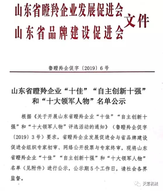 根據(jù)《關(guān)于開展山東省瞪羚企業(yè)十佳”“自主創(chuàng)新十強(qiáng)十大領(lǐng)軍人物評(píng)選活動(dòng)的通知》(魯?shù)闪缙蟠僮帧?/span>20193號(hào))要求,2019126日,山東省瞪羚企業(yè)發(fā)展促進(jìn)會(huì)、山東省品牌建設(shè)促進(jìn)會(huì)發(fā)布魯?shù)闪缙蟠僮?/span>[2019]6號(hào)文,公布經(jīng)過(guò)專家初審、網(wǎng)絡(luò)公開投票與專家終審,評(píng)選出了山東省瞪羚企業(yè)十佳、自主創(chuàng)新十強(qiáng)十大領(lǐng)軍人物。天意機(jī)械榮獲“山東省十佳瞪羚企業(yè)”稱號(hào)。